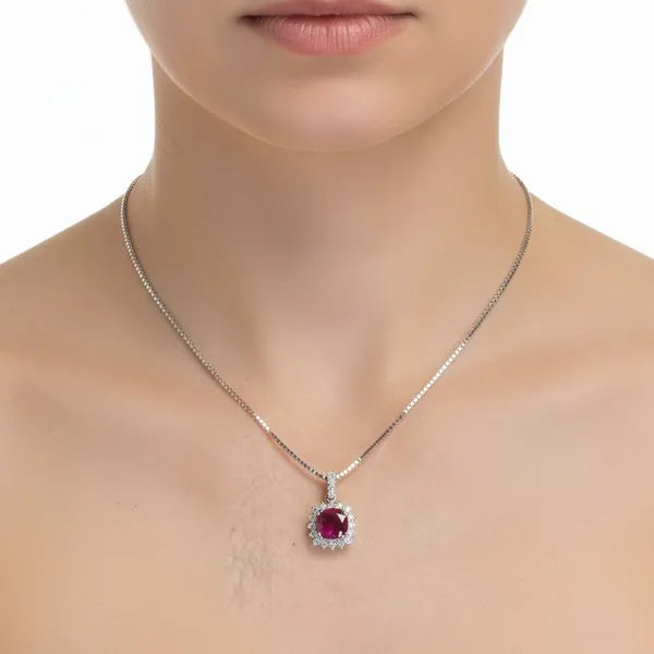 • Chain Length: 16” • Clasp: Lobster Claw • Metal: 14K White Gold • Stone Type: Natural Ruby • Stone Size: 1.11 ct. • Diamonds: .20 (ct. tw.)