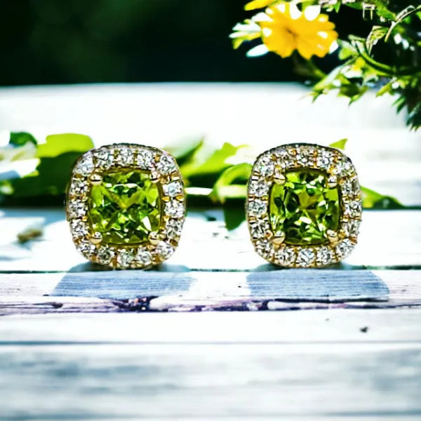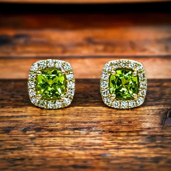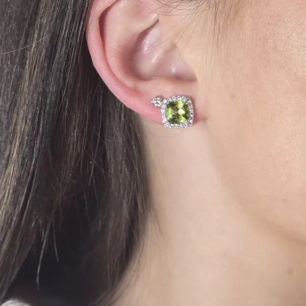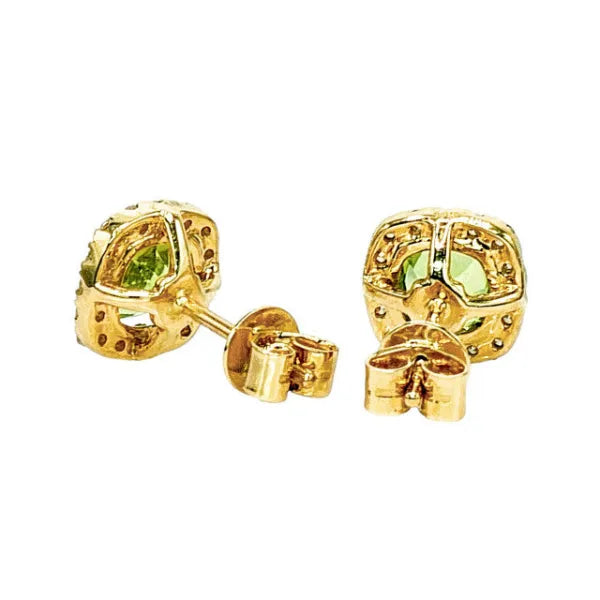 • Metal: 14K Yellow Gold • Stone Type: Peridot • Stone Size: 1.21 ct. • Diamonds: .21 (ct. tw.) Peridot Earrings Surrounded by Round Pave Diamonds. Our earrings come with friction backs unless otherwise noted.