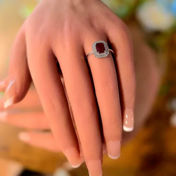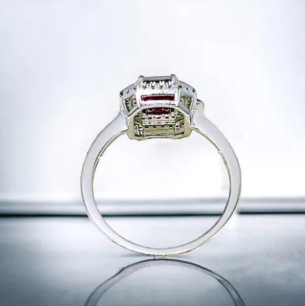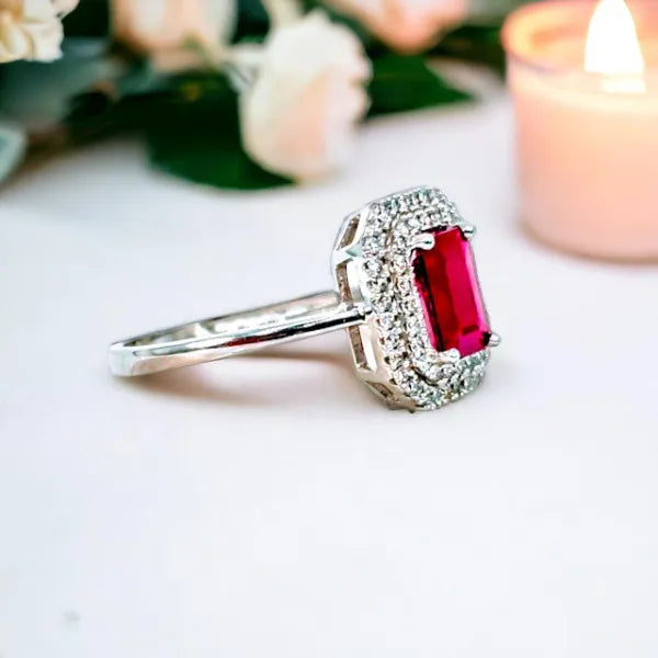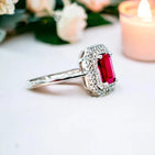 14K White Gold Ruby and Double Diamond Halo Ring